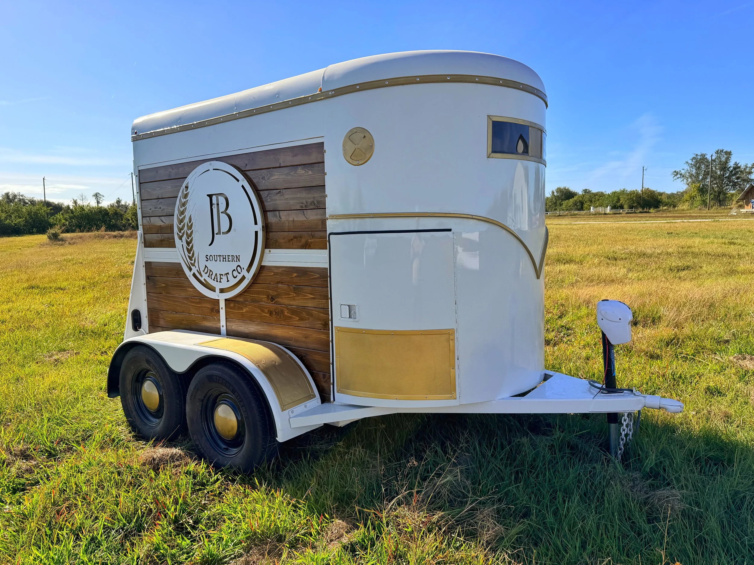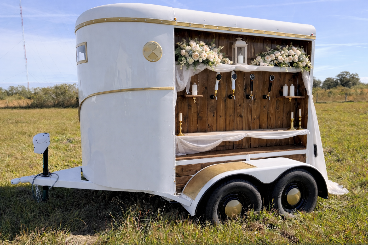 Our signature setup is a fully restored 1980s horse trailer designed to be as eye-catching as it is functional. Finished in a clean white and gold color palette, the trailer features natural cedar wood accents and gold draft taps that bring a warm, elevated look to any event.